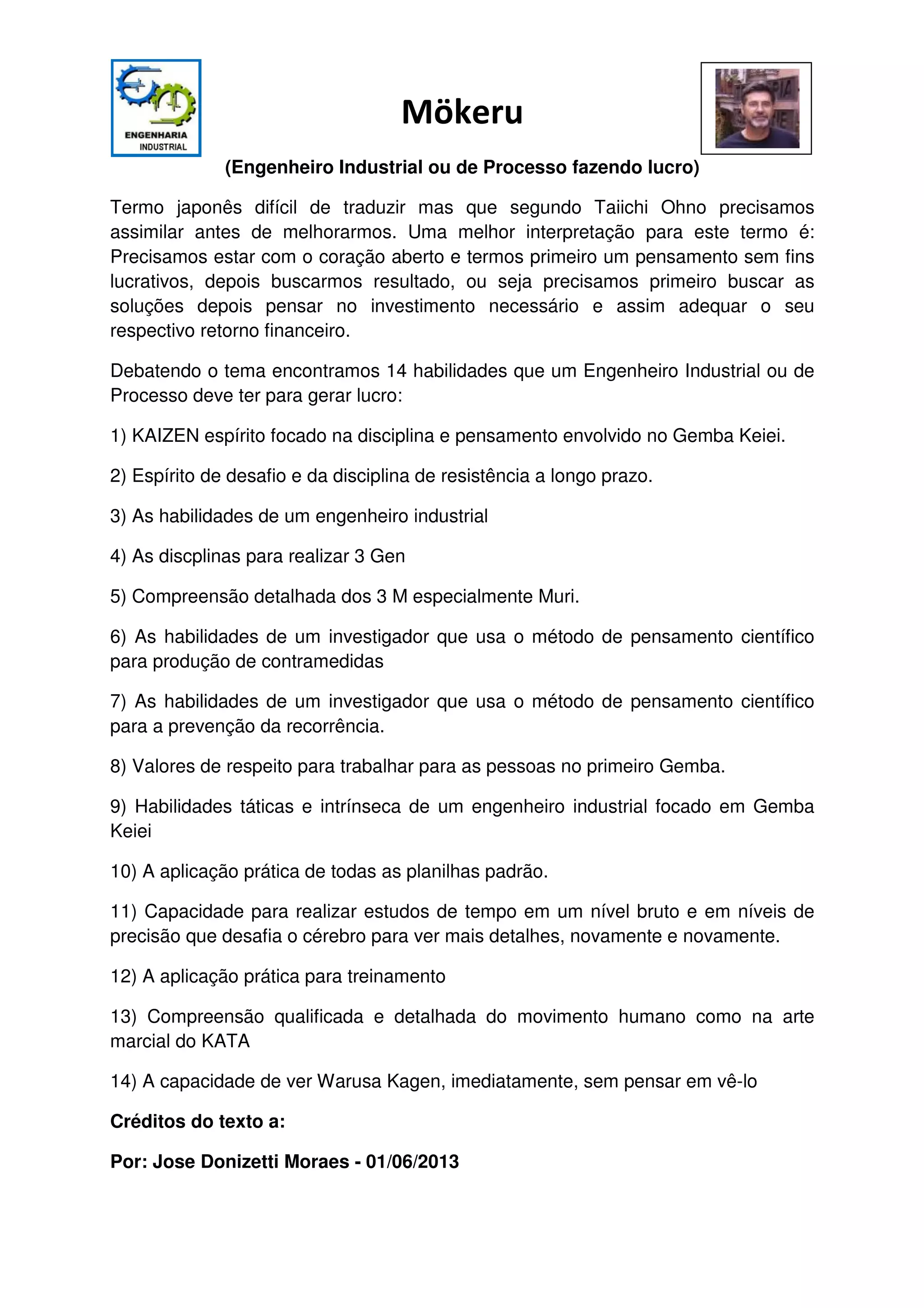Mökeru é um termo japonês que significa ter um pensamento sem fins lucrativos e buscar soluções antes de considerar o investimento necessário. Há 14 habilidades essenciais para engenheiros industriais gerarem lucro, incluindo o espírito de melhoria contínua, resistência, compreensão dos processos de produção e habilidades de investigação para prevenir problemas.