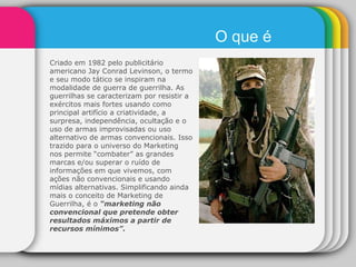 O documento descreve os conceitos e estratégias do marketing de guerrilha, incluindo sua inspiração na guerra de guerrilha e seu objetivo de obter resultados máximos com recursos mínimos. Ele explica técnicas como emboscada, intervenção urbana, astroturfing e viral para promover marcas de forma criativa e surpreendente.