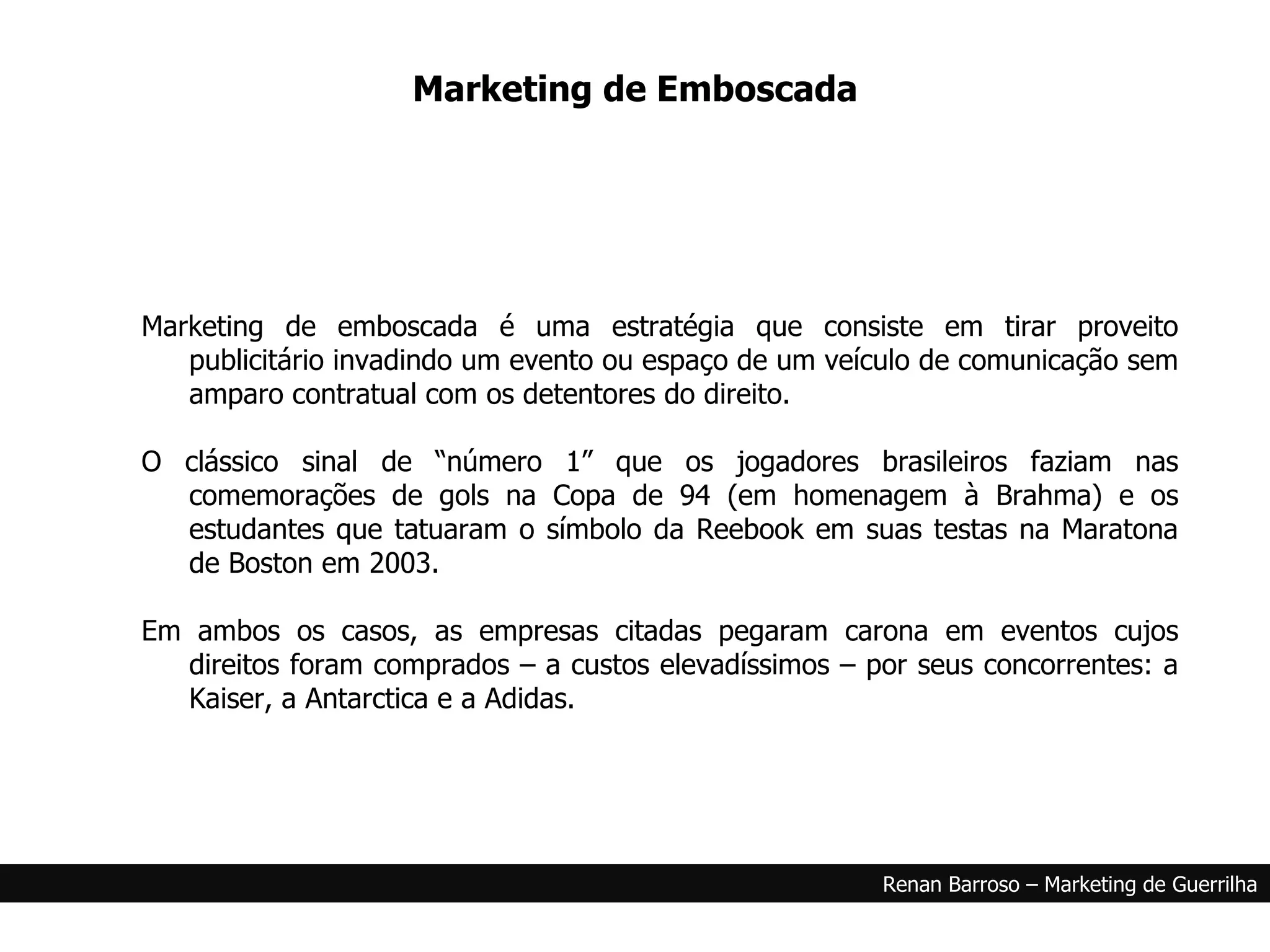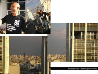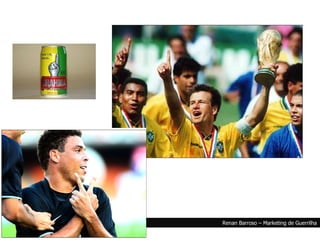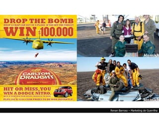 O documento discute três estratégias de marketing: 1) Marketing de emboscada, que se aproveita de eventos sem permissão para promover marcas; 2) Marketing invisível, que usa pessoas comuns para endossar produtos; 3) Balls Marketing, ações arriscadas que podem atrair atenção da mídia caso dêem certo.