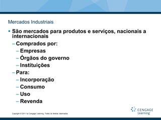 1. O documento discute os mercados industriais, definindo-os como mercados para produtos e serviços comprados por empresas, órgãos governamentais e instituições.