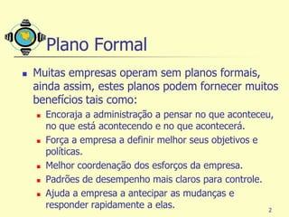 O capítulo discute o planejamento estratégico de marketing, incluindo (1) as etapas do planejamento estratégico como definir a missão, objetivos e metas, (2) desenvolver estratégias de crescimento para o portfólio de negócios, e (3) o papel do marketing no planejamento estratégico multifuncional de uma empresa.
