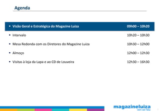 O documento descreve a agenda do evento Magazine Luiza Day, que inclui apresentações sobre a visão estratégica e os principais indicadores da companhia, além de uma mesa redonda com os diretores do Magazine Luiza. O evento também inclui visitas às lojas físicas e centros de distribuição da empresa.