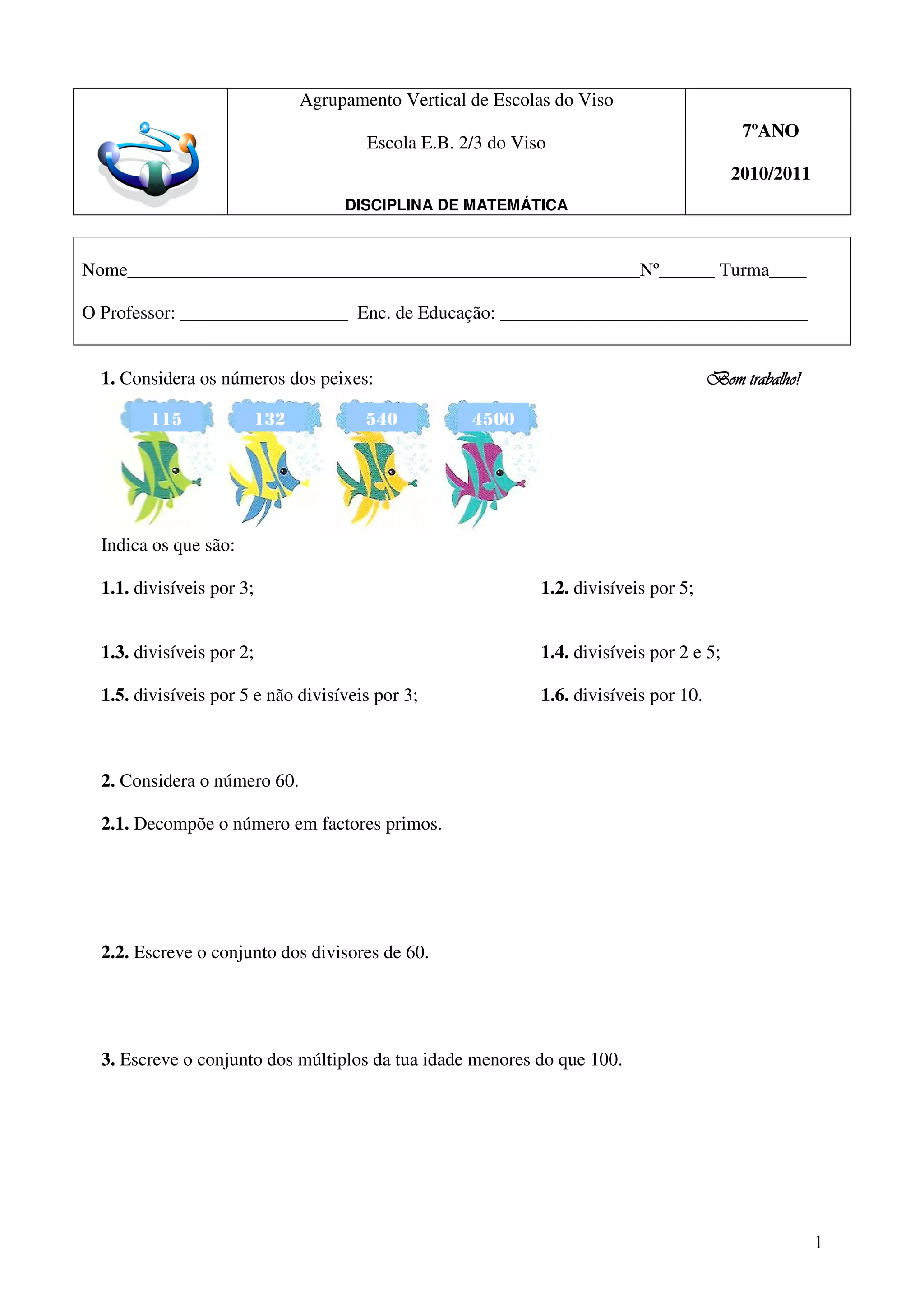 1. O documento apresenta um conjunto de exercícios de matemática sobre números e operações numéricas como divisibilidade, decomposição em factores primos, conjuntos de divisores e múltiplos.