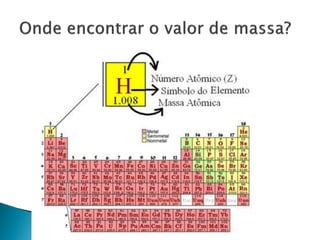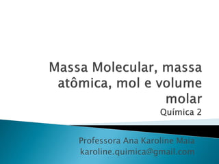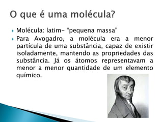 O documento discute conceitos fundamentais de molécula, átomo, massa atômica, quantidade de matéria (mols) e suas aplicações em cálculos químicos. Explica que uma molécula é composta por pelo menos dois átomos e apresenta exemplos de fórmulas químicas.