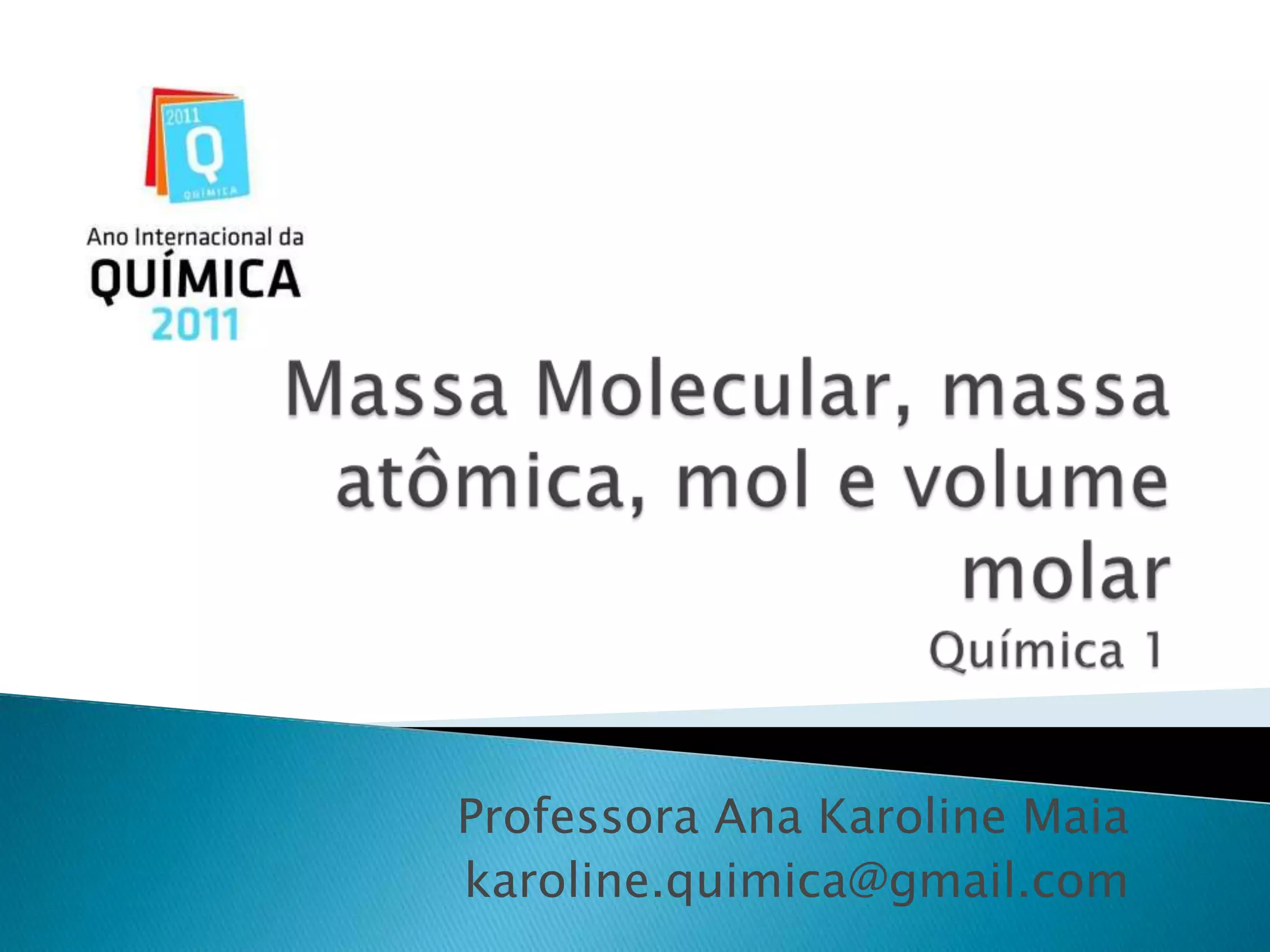 O documento discute conceitos fundamentais da química como molécula, massa atômica, mol, volume molar e quantidade de matéria. Explica que uma molécula é composta de pelo menos dois átomos e apresenta a hipótese de Avogadro de que volumes iguais de gases contém o mesmo número de moléculas. Também define o que é massa atômica e molecular e como medir a quantidade de matéria em mols.