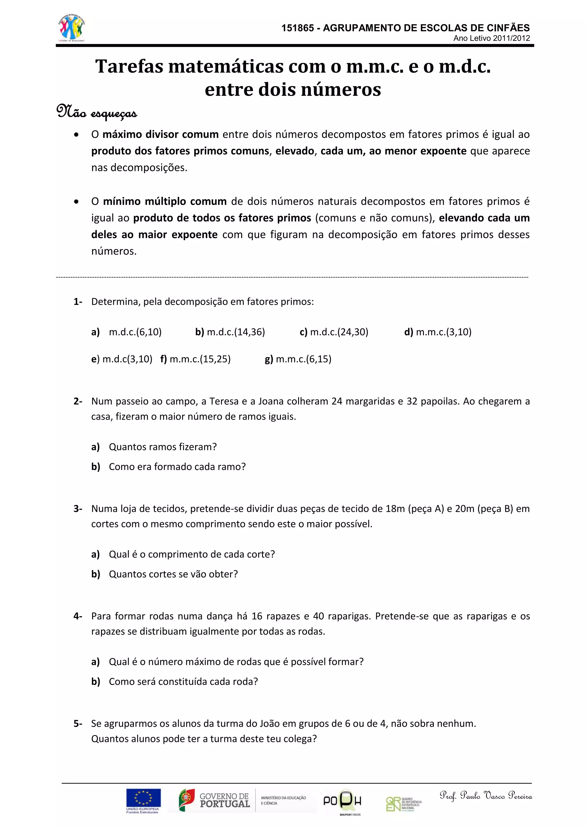 2) Inclui 14 exercícios sobre o cálculo e aplicações do m.d.c. e m.m.c. em problemas matemáticos.