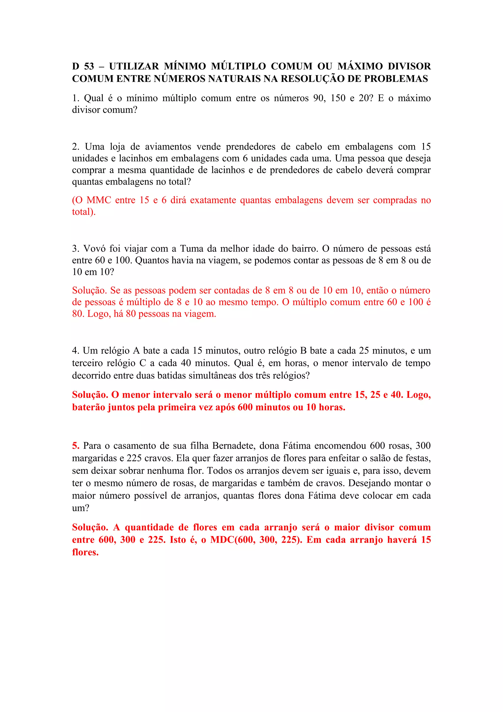 Este documento apresenta exercícios sobre o uso do mínimo múltiplo comum e máximo divisor comum entre números naturais para resolver problemas. Os exercícios abordam cálculos envolvendo MMC e MDC para determinar quantidades de embalagens, pessoas ou arranjos de flores necessários.