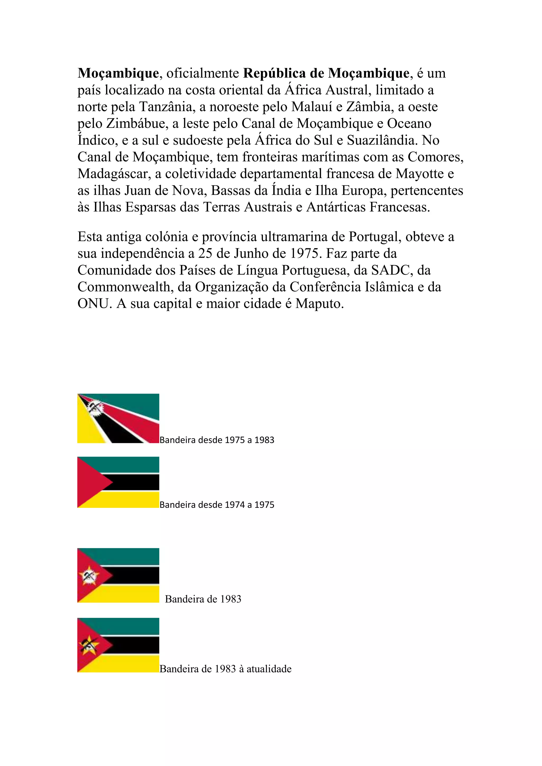 Moçambique é um país da costa leste da África, limitado por Tanzânia, Malawi, Zâmbia, Zimbabwe, África do Sul e Canal de Moçambique. Foi uma colônia portuguesa que obteve independência em 1975 e tem Maputo como capital. Sua população é de cerca de 20 milhões de habitantes e possui 11 províncias.
