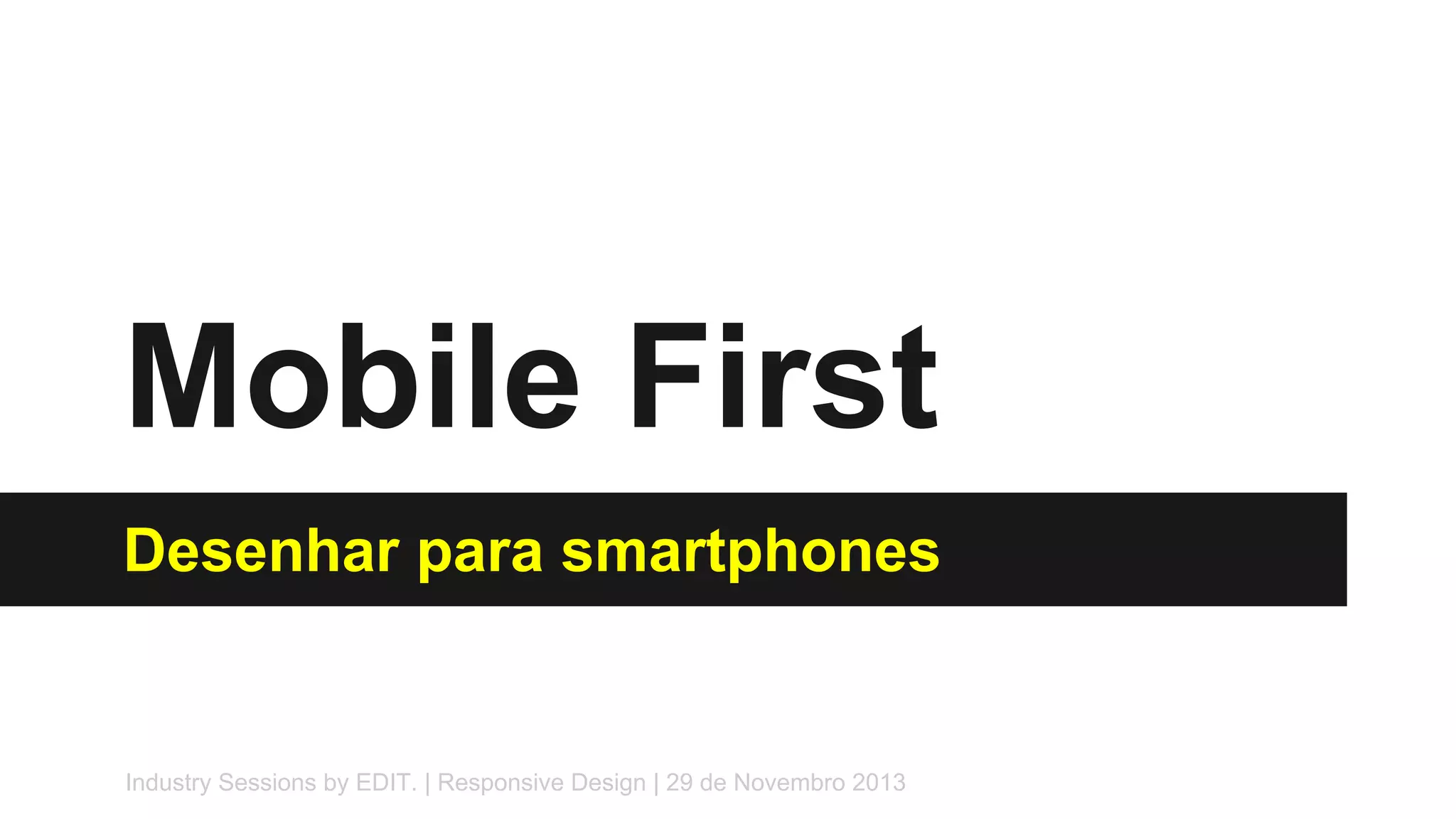 O documento discute o desenvolvimento de sites para dispositivos móveis com foco nos smartphones. Apresenta estatísticas mostrando o crescimento significativo do uso de smartphones e a importância de desenvolver sites mobile first. Também discute comportamentos comuns de uso de smartphones e princípios para organização da informação em sites mobile, como priorizar o conteúdo sobre a navegação e manter elementos de navegação simples e relevantes.