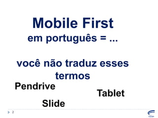O documento discute a abordagem "Mobile First" no desenvolvimento de produtos digitais. Defensores de grandes empresas como Google, Facebook e Adobe argumentam que os desenvolvedores devem projetar primeiro para dispositivos móveis, pois são aplicações melhores e é o que os usuários esperam. O documento também destaca o crescimento explosivo dos dispositivos móveis e sua importância crescente nas nossas vidas.