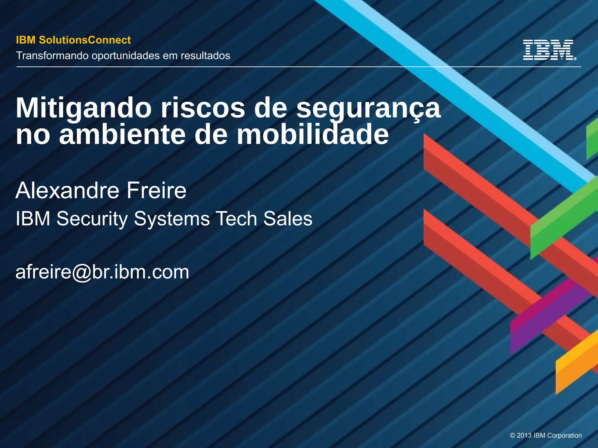 O documento aborda os desafios e soluções para mitigar riscos de segurança em ambientes de mobilidade, destacando a importância da segurança em dispositivos móveis que são frequentemente utilizados para acessar serviços corporativos e financeiros. A IBM propõe uma abordagem integrada para gerenciamento de segurança, que inclui autenticação, criptografia e controle de acesso a aplicações, buscando proteger dados em trânsito e minimizar vulnerabilidades. Além disso, enfatiza a necessidade de políticas de segurança adaptativas e a automação no gerenciamento de dispositivos móveis para garantir a conformidade e a proteção de informações sensíveis.