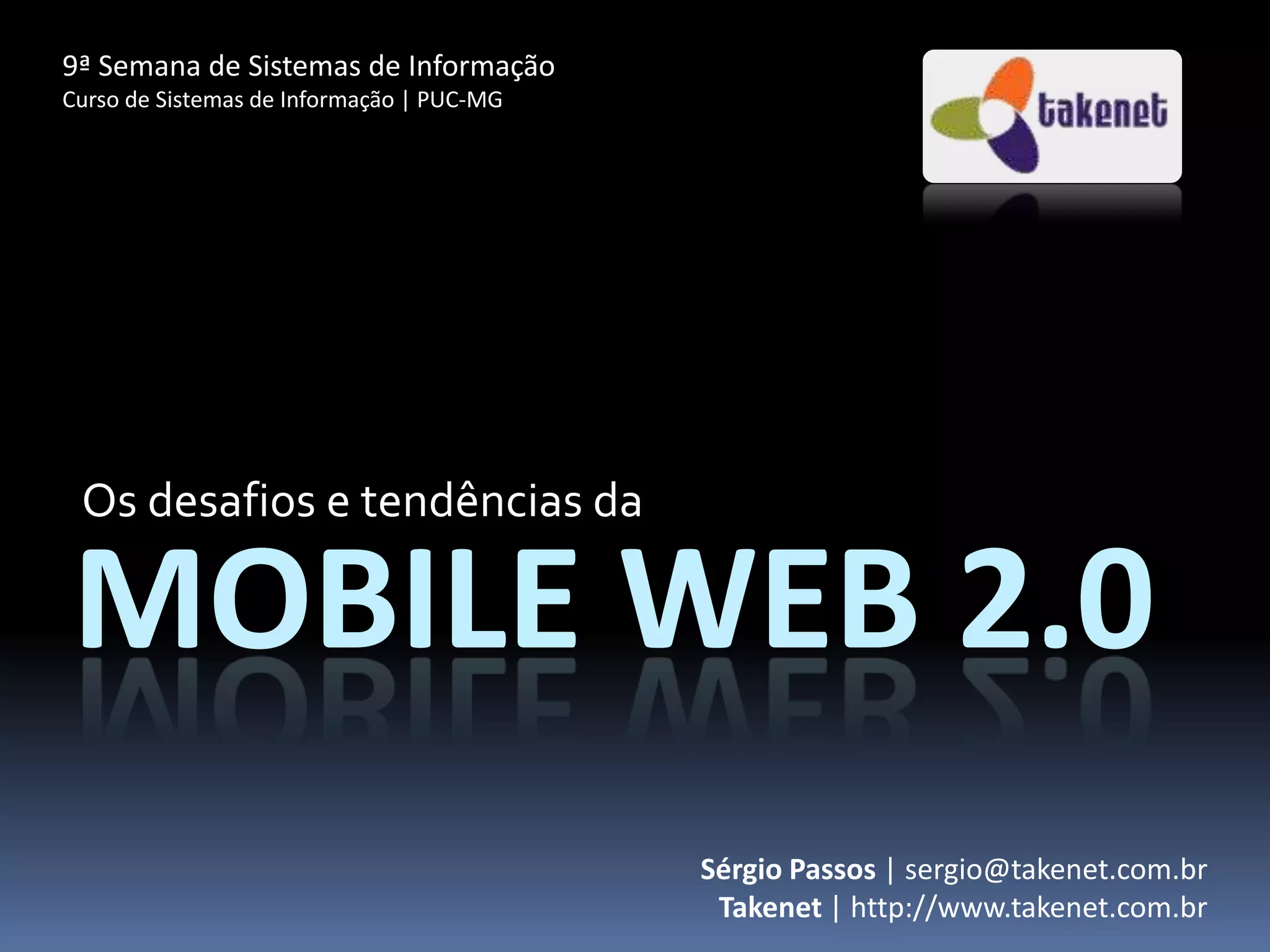 O documento apresenta as tecnologias e tendências da Mobile Web 2.0, incluindo: (1) a crescente mobilidade e convergência proporcionadas pelos celulares; (2) como a Web 2.0 permite que os usuários gerem conteúdo; e (3) como a Takenet aplica esses princípios em soluções como Moblog, Foto Torpedo e Torpedão.