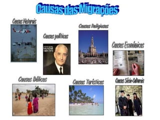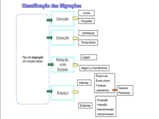 O documento discute padrões migratórios atuais, incluindo o crescimento das migrações internacionais a longo prazo e a feminização dos movimentos migratórios. Grandes movimentos migratórios atuais incluem deslocações da América Latina, África e Ásia para a Europa e EUA. Consequências nas áreas de origem incluem diminuição da população e taxa de natalidade, enquanto nas áreas de destino há aumento da população e taxa de natalidade. O êxodo rural causa