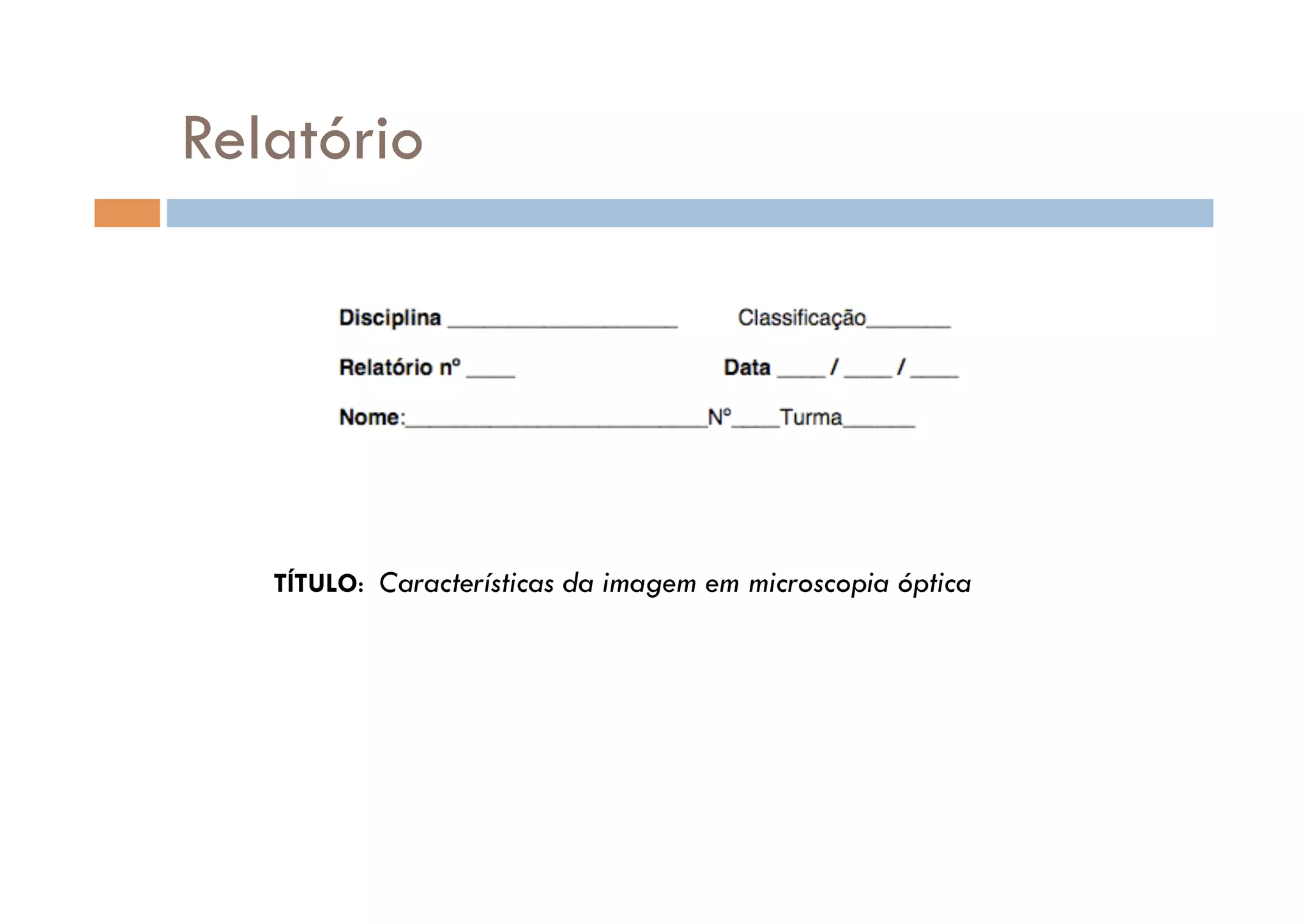 Este relatório descreve um experimento para observar as características da imagem em microscopia óptica. Quadrados de papel com letras foram observados a olho nu e sob o microscópio para comparar. As imagens sob o microscópio eram ampliadas, invertidas e simétricas em relação às vistas a olho nu. O experimento demonstrou que o microscópio permite uma resolução maior do que a vista humana.