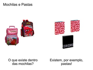 O documento discute a organização de arquivos e pastas em computadores e mochilas. Ele explica que mochilas contêm itens como pastas com desenhos, cálculos e fotografias, assim como dispositivos como MP4s. Computadores armazenam arquivos em pastas dentro de discos rígidos, com pastas contendo trabalhos, música e fotografias organizadas em uma estrutura de árvore.