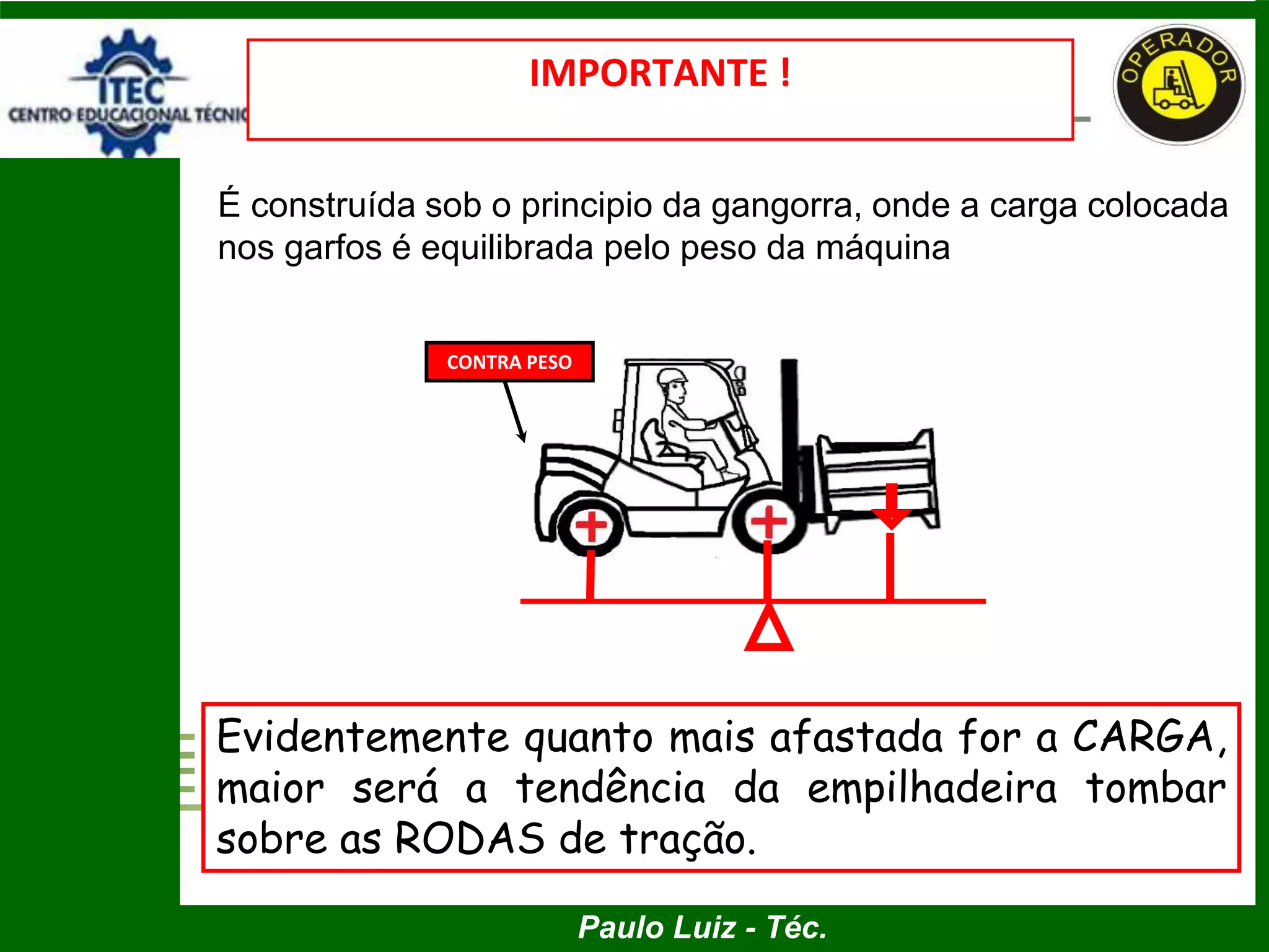 O documento fornece instruções sobre o funcionamento e operação segura de empilhadeiras. Explica que o centro de rotação é o eixo dianteiro e que a carga nos garfos equilibra o peso da máquina. Também destaca a importância de verificar freios, pneus e outros itens antes do uso e conduzir de forma segura de acordo com as condições.