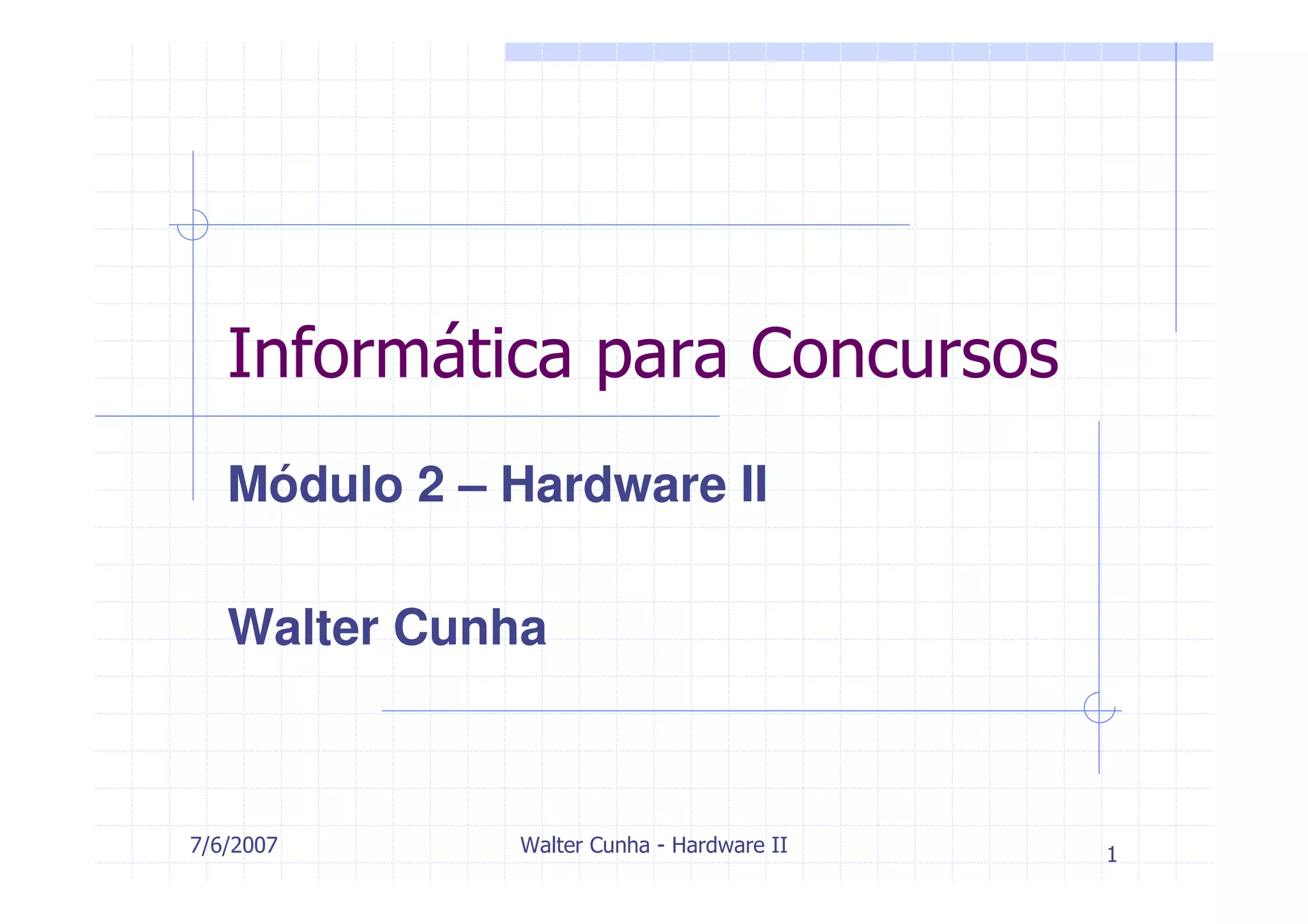 Este documento apresenta o módulo 2 de um curso sobre hardware ministrado por Walter Cunha. O módulo discute os principais barramentos e periféricos de computadores, incluindo ISA, PCI, AGP, IDE, SATA, SCSI, portas seriais e paralelas, além de placas adicionais como de vídeo, som, rede e modem. O documento fornece detalhes técnicos sobre cada tópico e exercícios para avaliação.