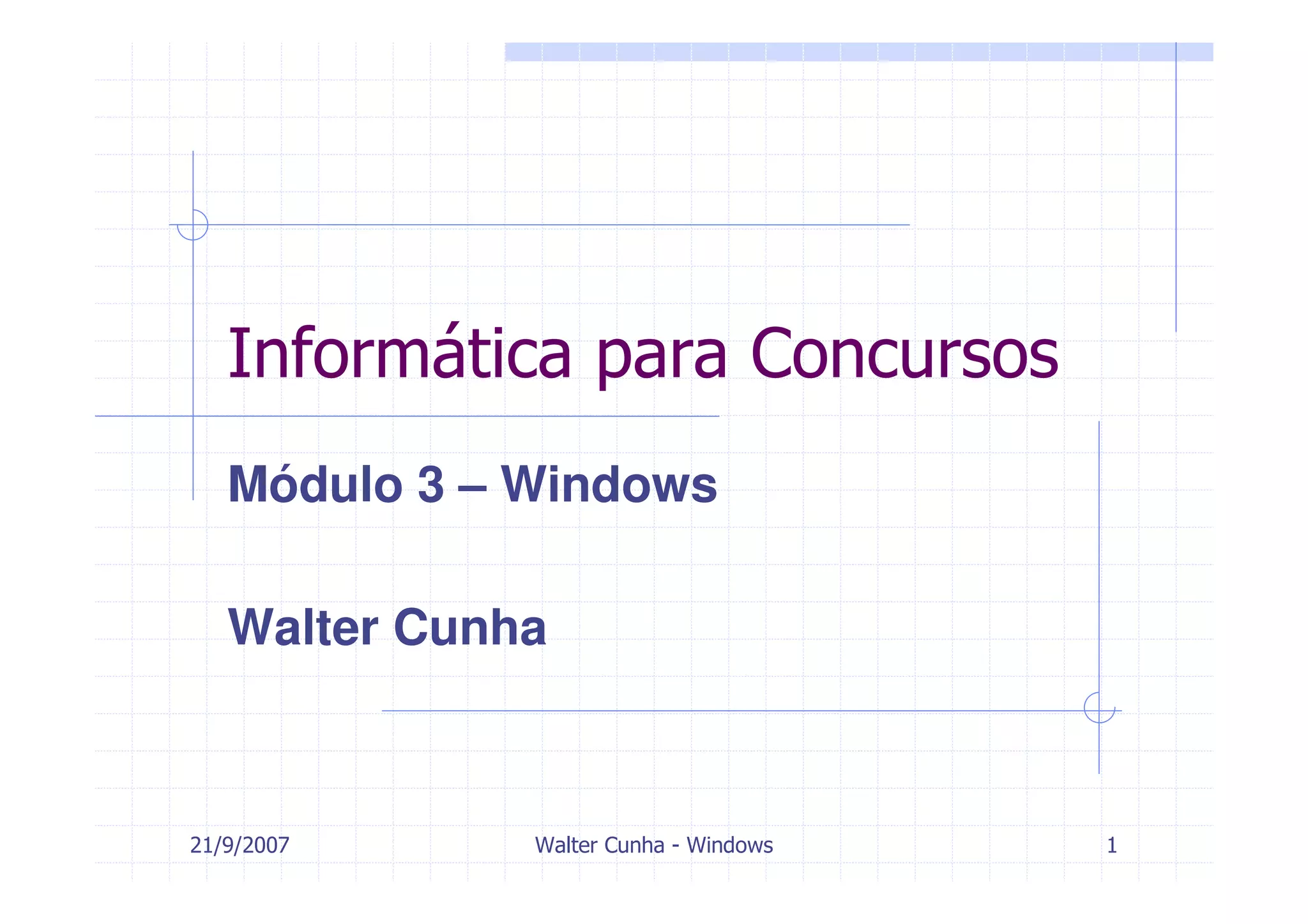 O documento apresenta um curso sobre o sistema operacional Windows ministrado por Walter Cunha, abordando os seguintes tópicos: revisão de hardware, sistemas de arquivos FAT e NTFS, versões da família DOS e NT do Windows, visão geral de recursos como área de trabalho e botão iniciar, além de informar o próximo módulo sobre os softwares Word e Excel.