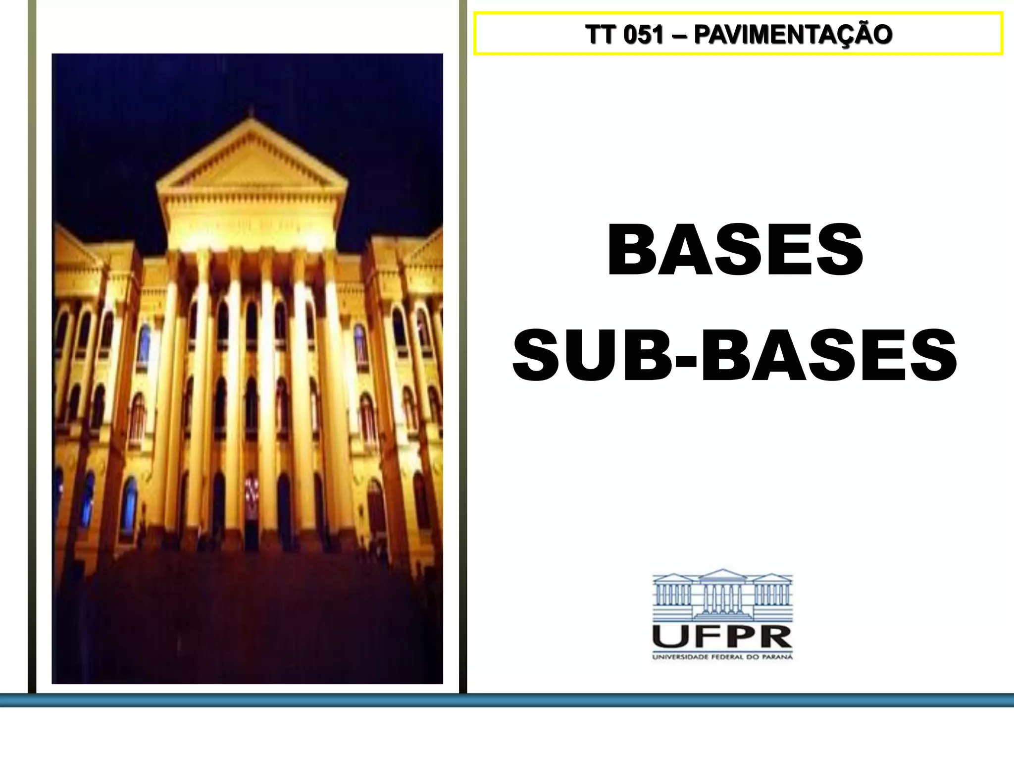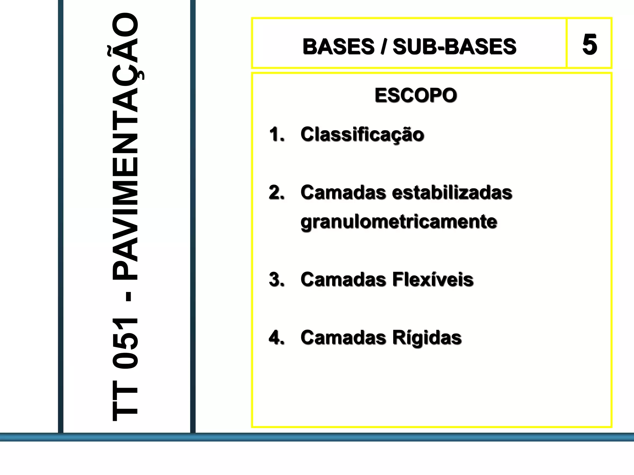 O documento discute os tipos de materiais utilizados em camadas de base e sub-base de pavimentação, incluindo suas classificações, especificações e métodos de execução. É descrito o uso de brita graduada simples, solo-agregado, solo arenoso fino laterítico e outros materiais granulares. Detalha os equipamentos e processos de construção dessas camadas.