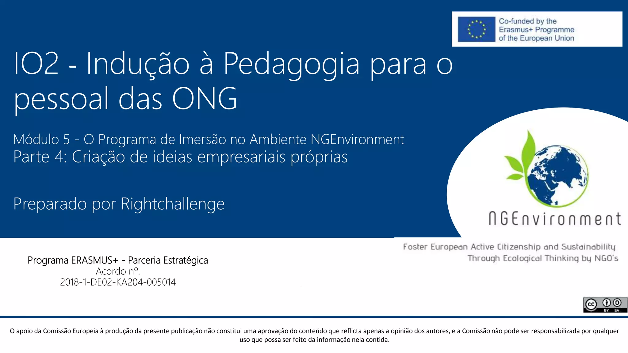 Este documento descreve o Módulo 5 de um programa de capacitação sobre empreendedorismo sustentável para funcionários de ONGs. O módulo aborda a criação de ideias empresariais próprias, incluindo como identificar oportunidades e desenvolver planos de negócios. O documento fornece etapas para o desenvolvimento de ideias, com foco em autoavaliação, identificação de competências e paixões.