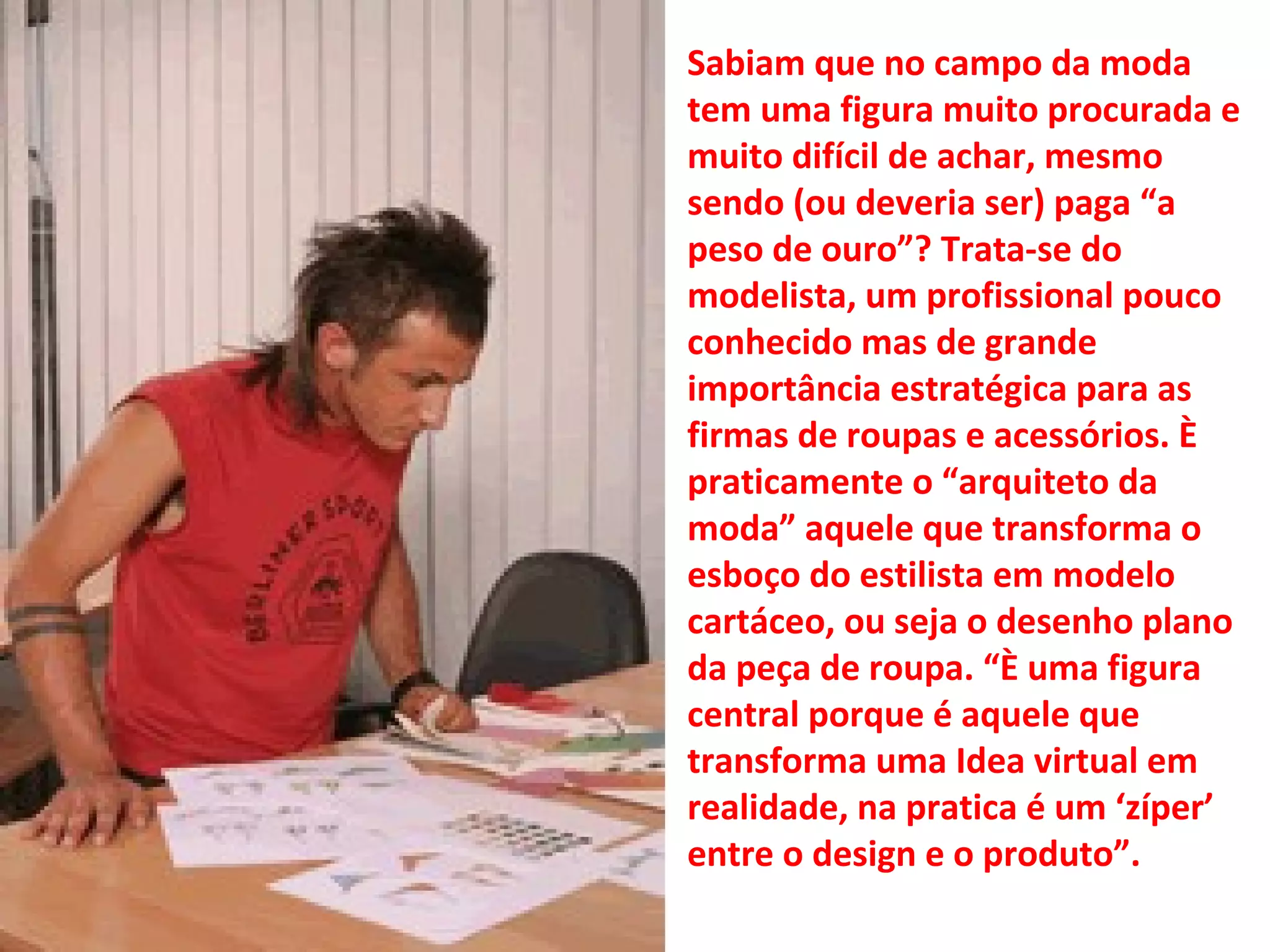O documento descreve a profissão de modelista, que transforma os esboços dos estilistas em modelos reais de roupas. O modelista indica como cortar tecidos e produzir peças, usando softwares de design. Embora as novas tecnologias tenham mudado seu trabalho, a competência profissional continua sendo essencial. A profissão é importante, mas pouco conhecida entre os jovens.