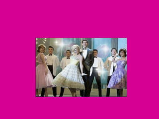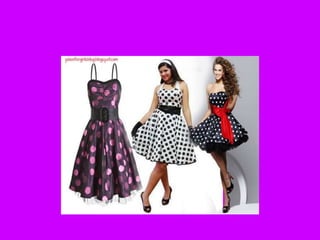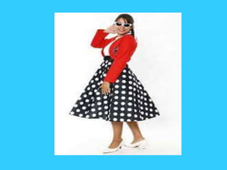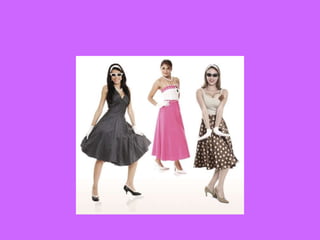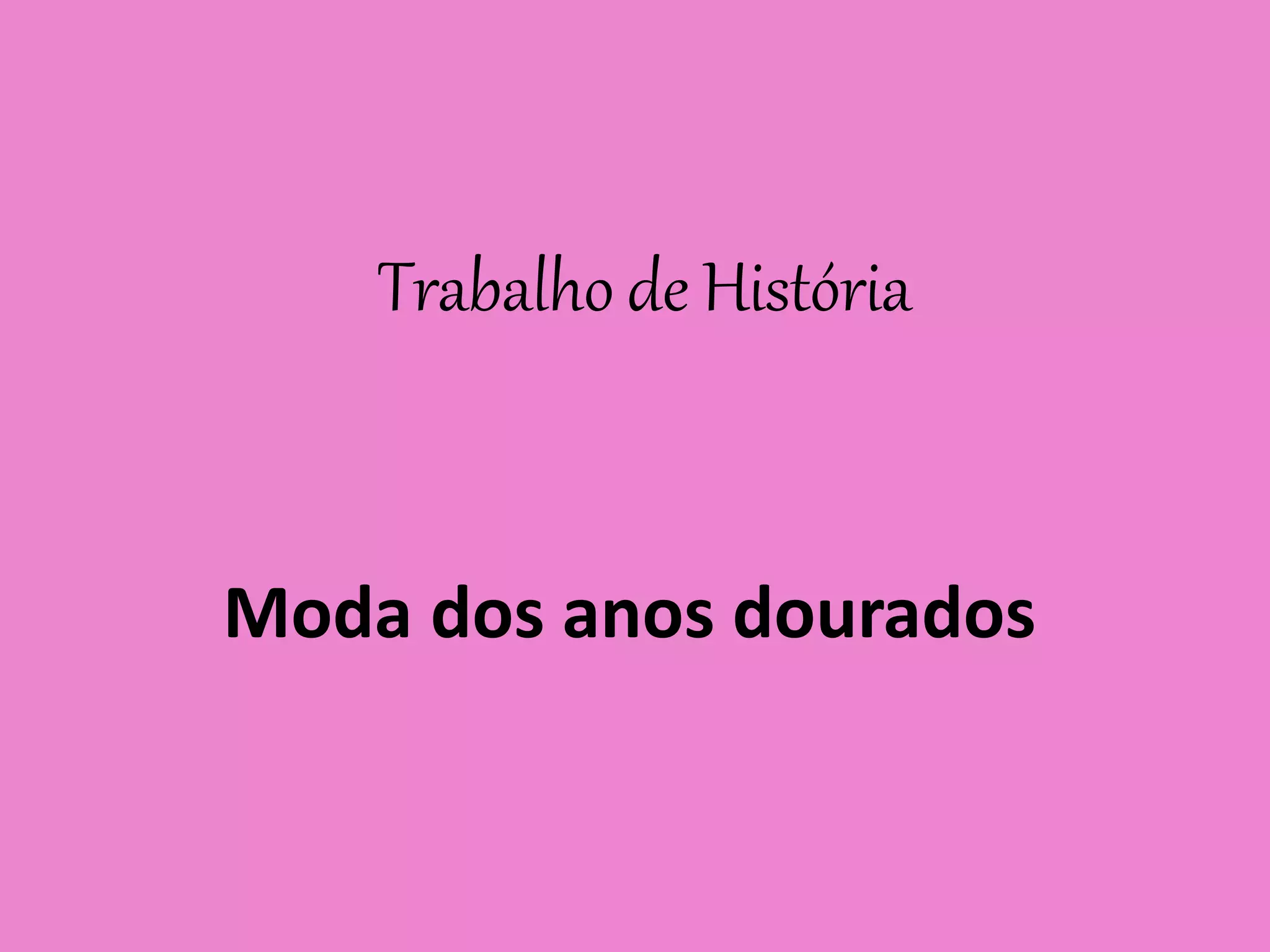 O documento descreve um trabalho de história sobre a moda dos anos dourados, incluindo um vestido de bolinhas e uma bolsa de mão prateada, bem como acessórios da época. O trabalho foi feito por um grupo de alunos do 5o ano B sob a orientação da professora Sandra.