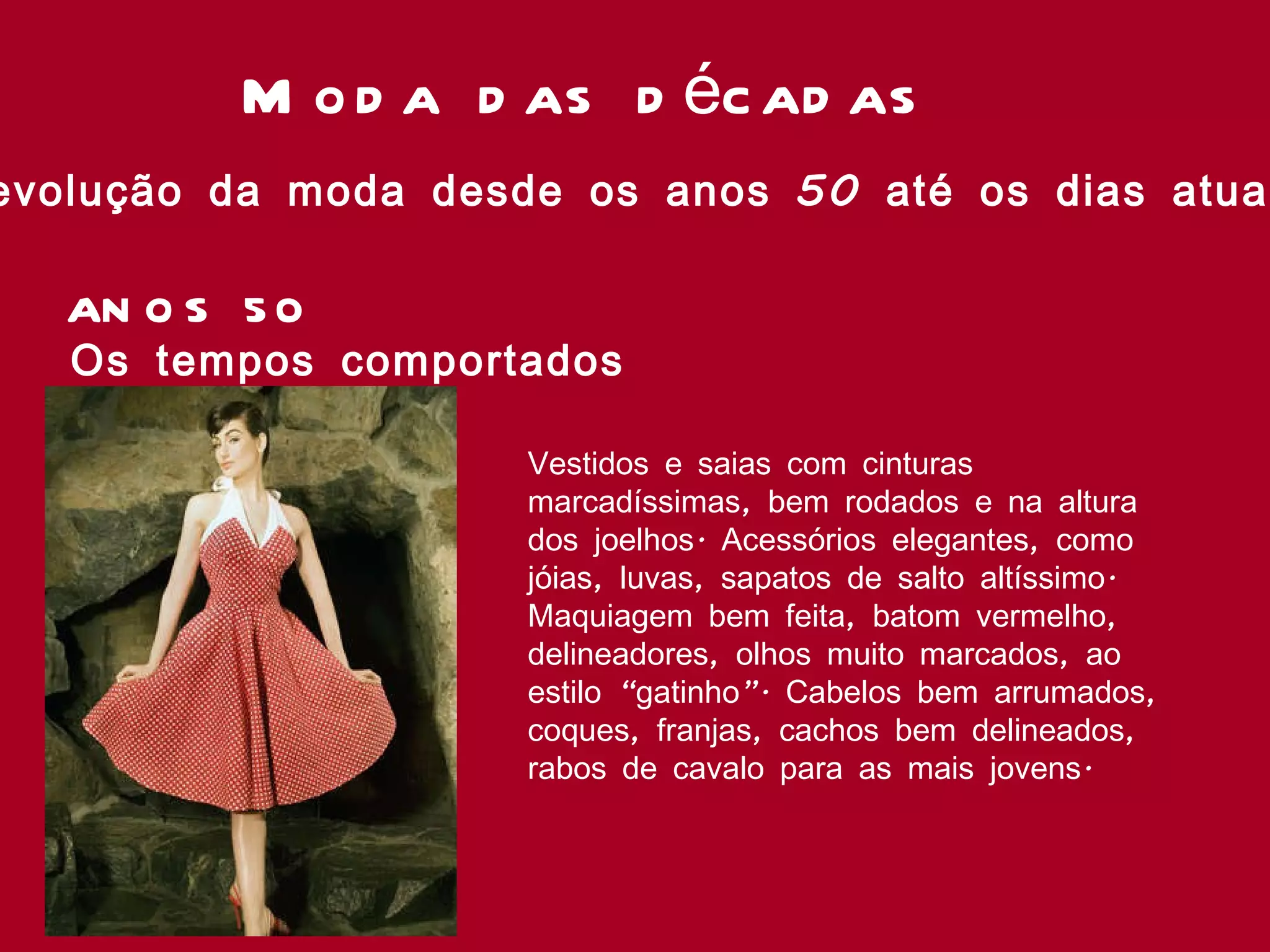 Os anos 50 foram marcados por vestidos e saias rodadas até os joelhos, maquiagem marcada e cabelos arrumados. Nos anos 60, minissaias e vestidos curtos se popularizaram, enquanto os anos 70 trouxeram estilo hippie com roupas largas. A década de 80 foi de cores, brilho e extravagância influenciada por Madonna e Cindy Lauper. Nos anos 90, influências de décadas anteriores se misturaram, como o grunge. Nos anos 2000, estilos do passado se misturaram com novos talent