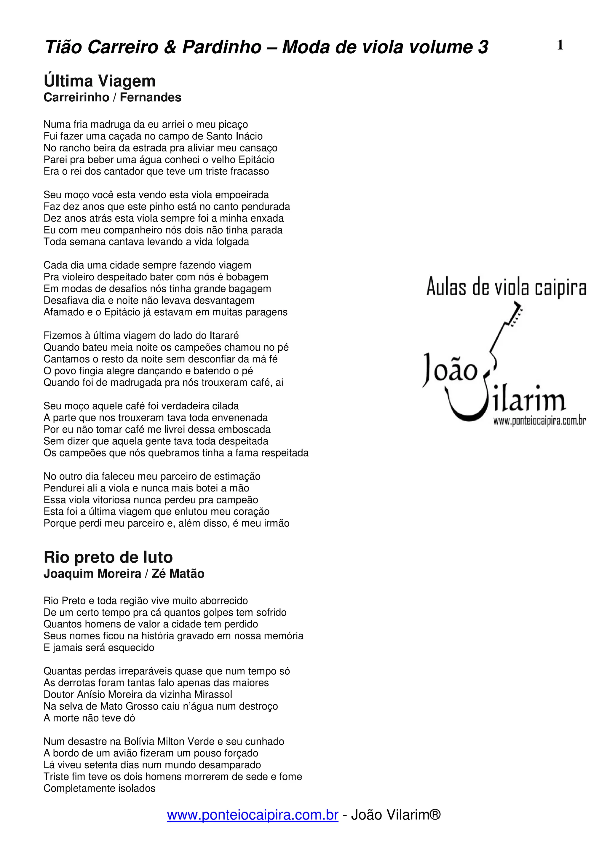 O documento apresenta cinco modas de viola que contam histórias diferentes. A primeira fala sobre um cantador chamado Epitácio que teve seu parceiro envenenado após uma desafio musical. A segunda lamenta as perdas sofridas pela cidade de Rio Preto. A terceira exalta as proezas de um boi de rodeio chamado Sete Ouro. A quarta conta a história de um peão que se gabava de ser o "Rei do Gado". E a quinta narra como um homem negro inocente salvou uma moça de uma