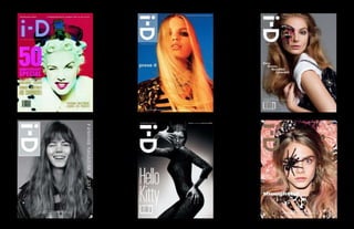 • A revistai-D é britânica dedicada a musica, moda, arte e a cultura jovem. Foi fundada pelo ex-diretor de arte da Vogue Terry Jones em 1980. • A revista ela é conhecida por sua fotografia e tipografia inovadora. Ela tem um estilo irreverente e corajoso, sem ter medo dos temas que se propõe. • Em 2009, Terry transformou a i-D em bimestral e focou em conteúdos pela internet. • Hoje a revista é considerada fonte de inspiração para apaixonados por moda e cultura. i-D
