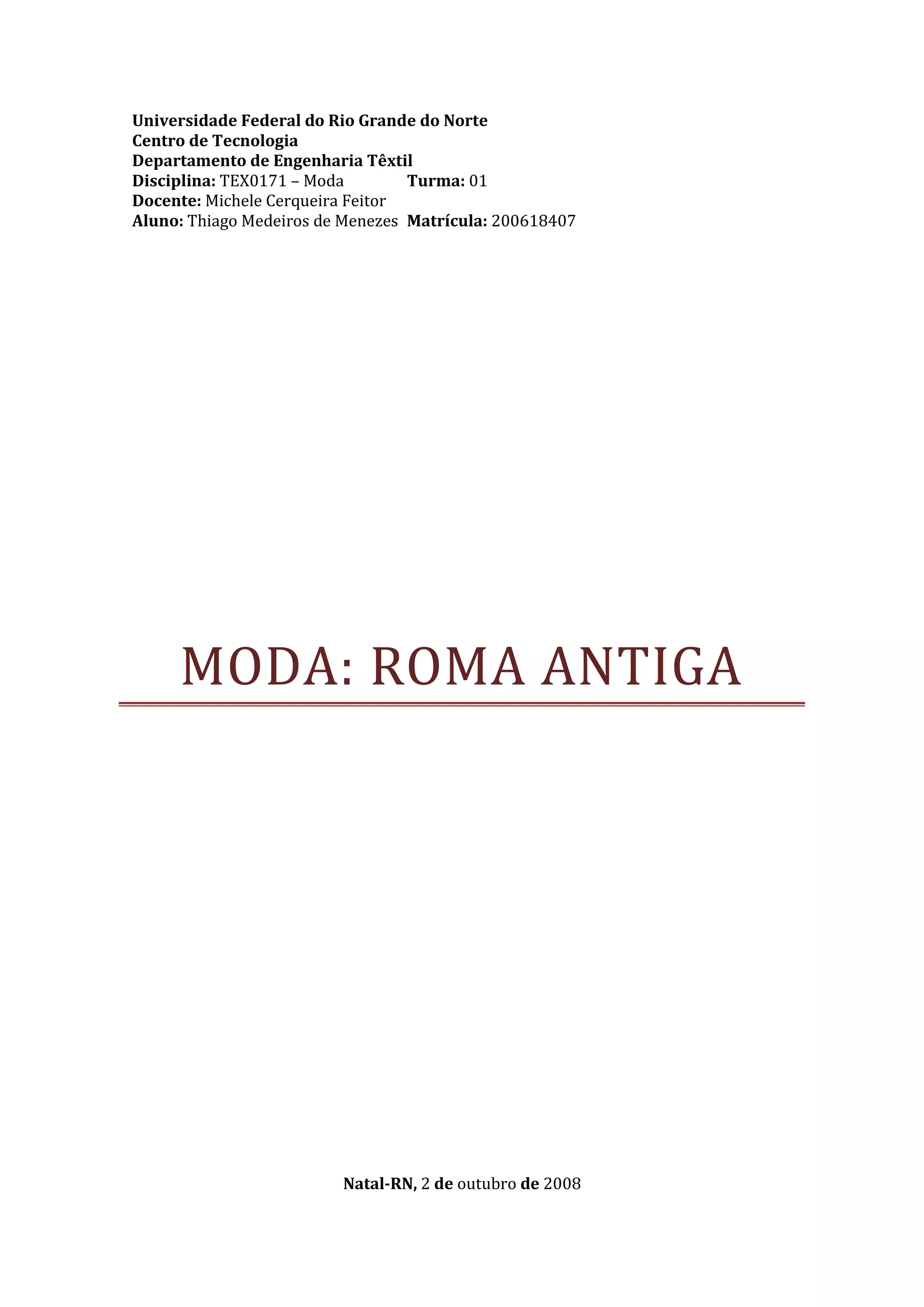 O documento descreve a moda na Roma Antiga, mencionando que a toga e a stola eram as principais peças de vestuário. Detalha como a toga variava de acordo com a função social e idade, e como a stola era o vestido tradicional das mulheres romanas. Também aborda outros itens como túnicas, saiotes, calças, penteados, barbas, calçados, chapéus e jóias usados pelos romanos.