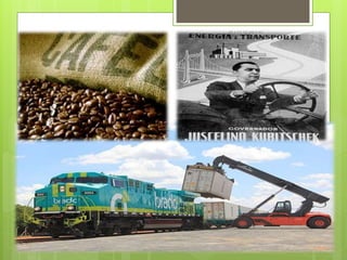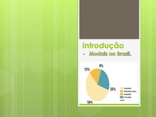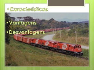 O documento discute os principais modais de transporte no Brasil, incluindo dutos, ferroviário, aéreo, aquaviário e rodoviário. Apresenta detalhes sobre documentação, tipos de embarcações/vagões, cálculo de cubagem e vantagens/desvantagens de cada modal. Como exemplo, descreve um projeto logístico utilizando rodoviário e aquaviário para exportar mangas dos EUA em menos de 15 dias pelo menor custo possível.