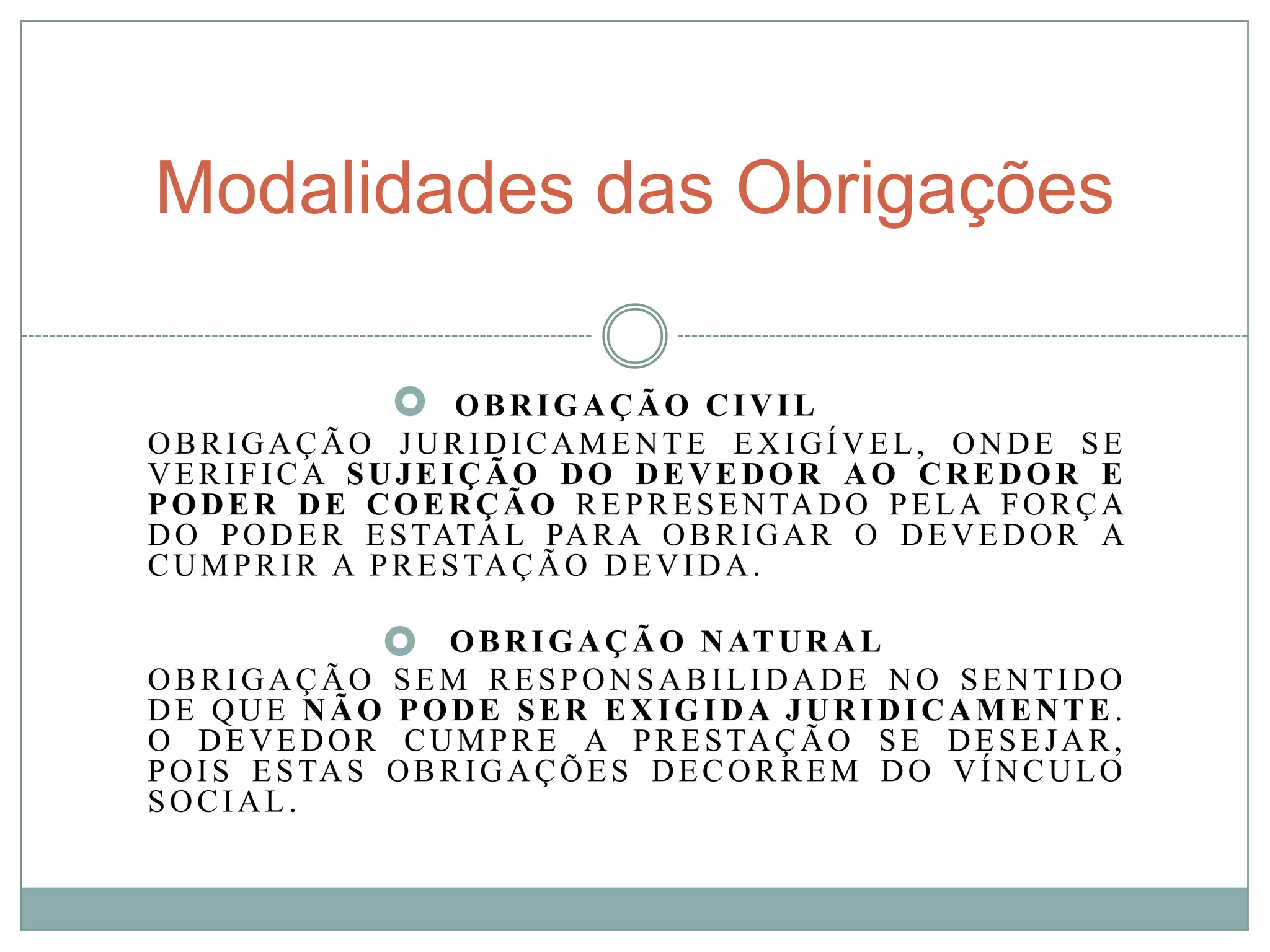 Este documento discute diferentes tipos de obrigações civis, incluindo obrigações naturais versus juridicamente exigíveis, obrigações principais versus acessórias, e obrigações em dinheiro versus em valor. Ele também descreve características como condicionalidade, termo, encargo, liquidez e divisibilidade.