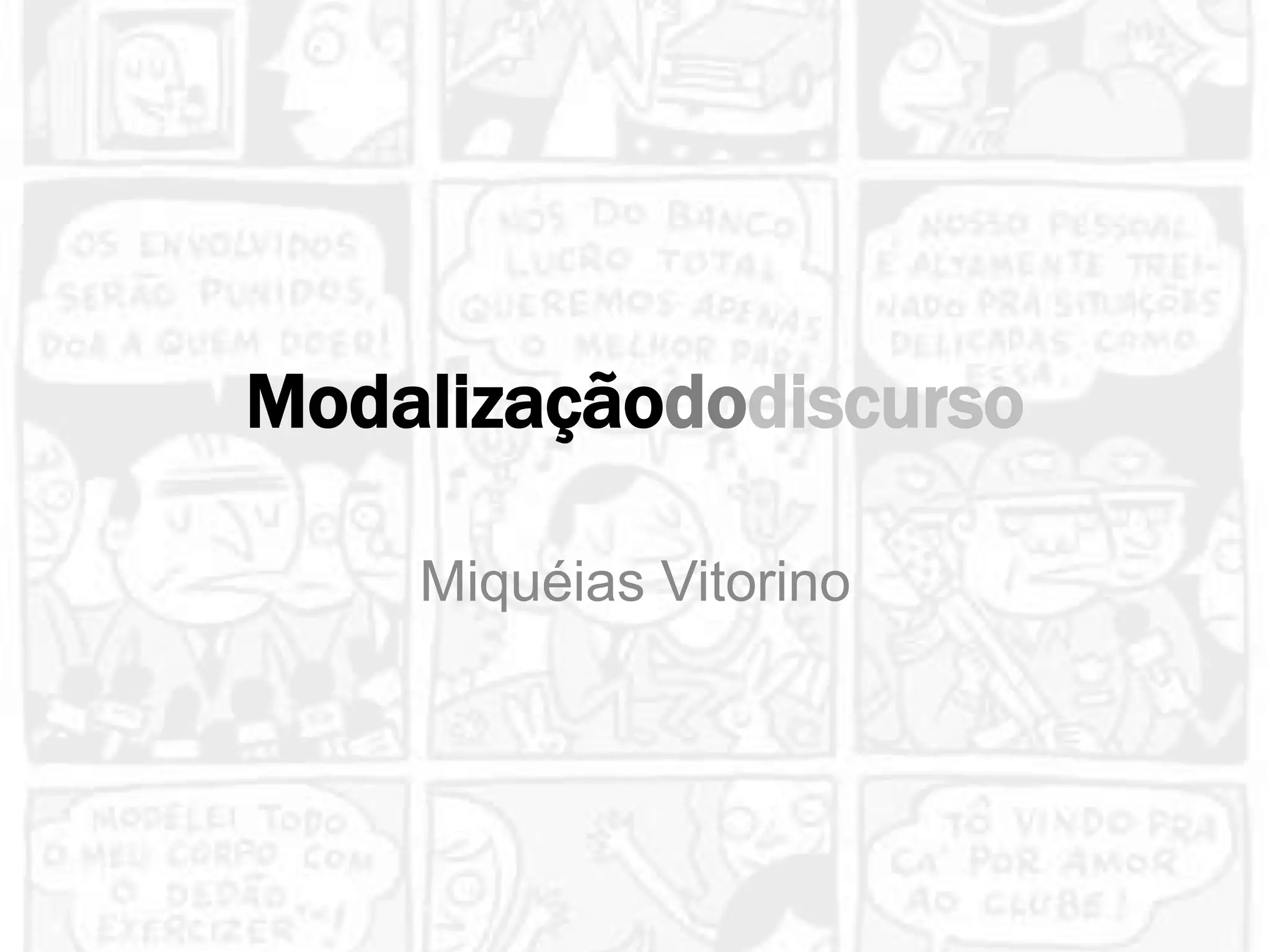 O documento discute os modalizadores do discurso e como eles modificam o significado de orações ao expressar necessidade, certeza, obrigatoriedade ou possibilidade. Existem modalizadores verbais como poder, dever e precisar e estruturas sintáticas e advérbios que também transmitem modalização. É importante analisar o contexto para interpretar corretamente o sentido da modalização.