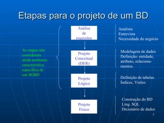 O documento descreve as etapas para projeto de banco de dados, incluindo análise de requisitos, projeto conceitual, lógico e físico. A análise de requisitos envolve caracterizar os dados necessários e especificar as necessidades dos usuários. O projeto conceitual modela os dados através de um diagrama entidade-relacionamento. Os projetos lógico e físico implementam o modelo conceitual em um sistema de gerenciamento de banco de dados.
