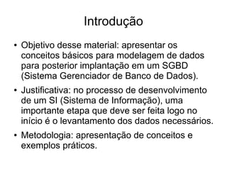 O documento apresenta os conceitos básicos de modelagem de dados para desenvolvimento de um sistema de informação, incluindo definição de entidades, atributos, relacionamentos e implementação em um banco de dados. Discute exemplos práticos de entidades como cliente, produto e nota fiscal e seus relacionamentos. Explica conceitos como tabelas, registros, campos, chaves primárias e estrangeiras.