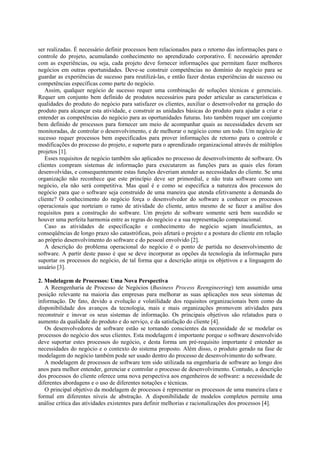 1) O documento discute a importância da modelagem de processos de negócio para o desenvolvimento de sistemas de informação. 2) Dois caminhos de pesquisa em engenharia de software são descritos: automação vs elicitação de requisitos. A modelagem de processos é uma área focada em requisitos. 3) A tecnologia de modelagem de processos é promissora para desenvolver software alinhado às necessidades organizacionais.