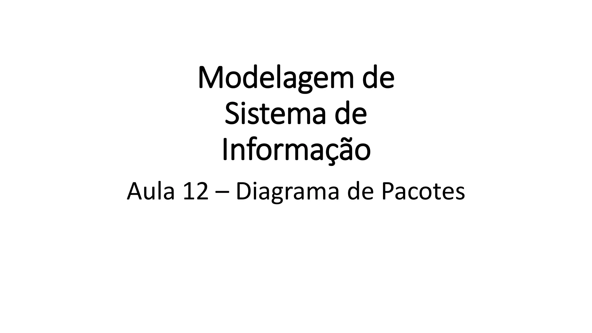O documento discute diagramas de pacotes, que dividem um sistema de informação em componentes modulares chamados pacotes. O documento fornece exemplos de como diagramas de pacotes podem ser usados para representar diferentes sistemas através de pacotes e suas relações.