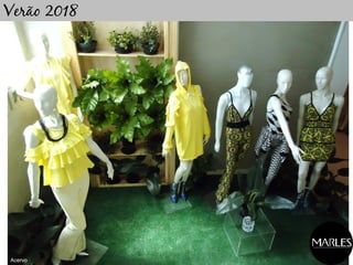 O documento apresenta uma lista de códigos de peças de roupas e acessórios de uma coleção de verão de 2018, incluindo tops, bottoms, vestidos e detalhes. As peças são identificadas por códigos como JV1233, JD0092, BX0021 e estão agrupadas por tipo de material ou processo de fabricação como malharia, estamparia e importados.