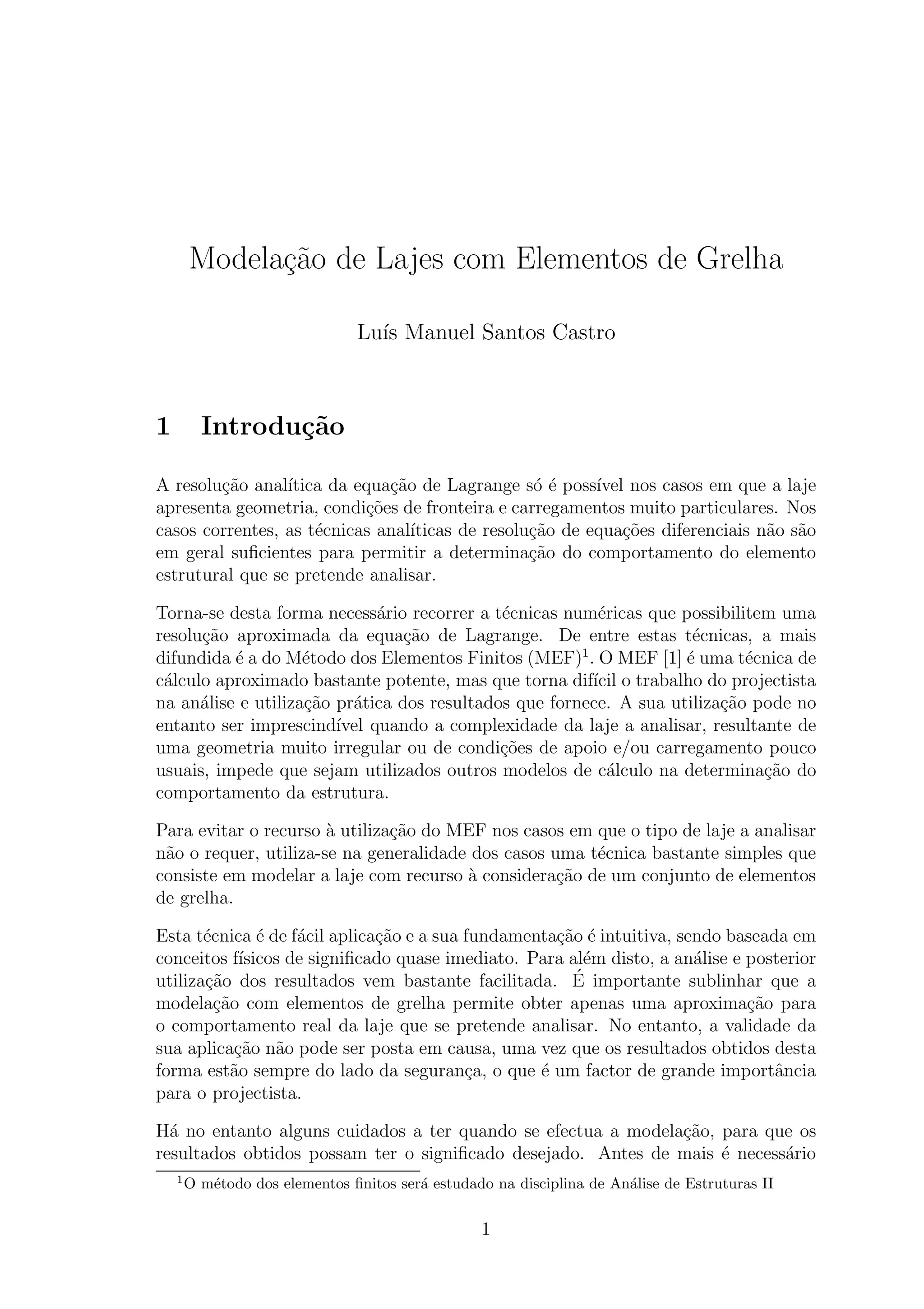 Este documento discute a modelação de lajes planas utilizando elementos de grade. Explica que esta técnica é mais simples do que o método de elementos finitos e fornece resultados conservadores. Detalha como definir a geometria da grade com base na largura das faixas da laje, e como mapear os deslocamentos e esforços entre a laje e os elementos da grade.