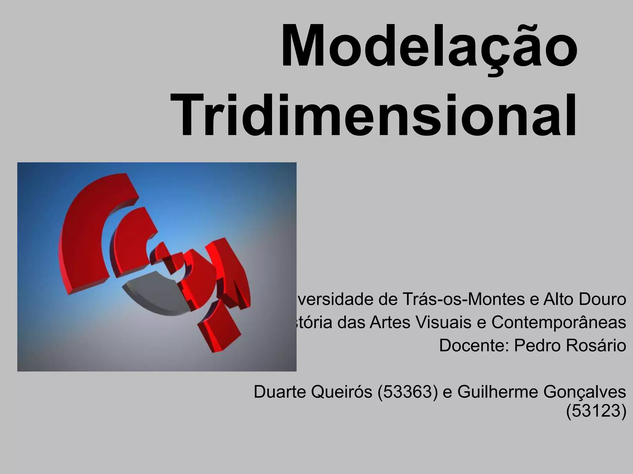 O documento discute a modelação tridimensional como parte da arte digital, explicando que permite criar objetos em 3D de forma realista através de softwares. Divide o processo de modelação em quatro fases- modelação, configuração da cena, geração da cena e protótipos- e dá exemplos como a criação de um gorila 3D e como foi usado no filme do Hulk.