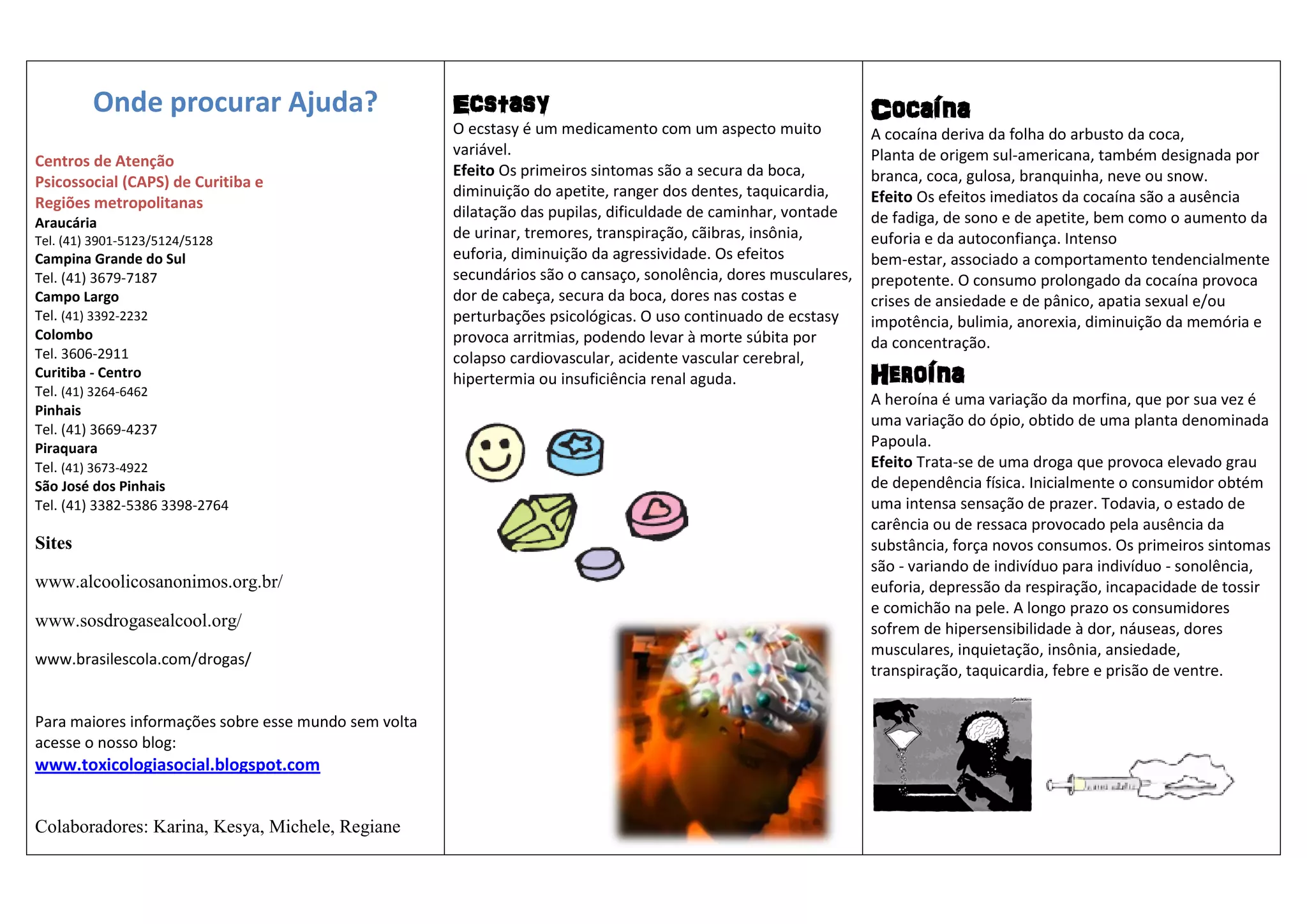 O documento fornece informações sobre diferentes drogas ilícitas, seus efeitos e onde procurar ajuda. Em três frases: Discute os efeitos do ecstasy, cocaína e heroína, incluindo sintomas físicos e riscos à saúde a longo prazo de seu uso. Também lista locais de apoio como Centros de Atenção Psicossocial para dependentes químicos procurarem ajuda.