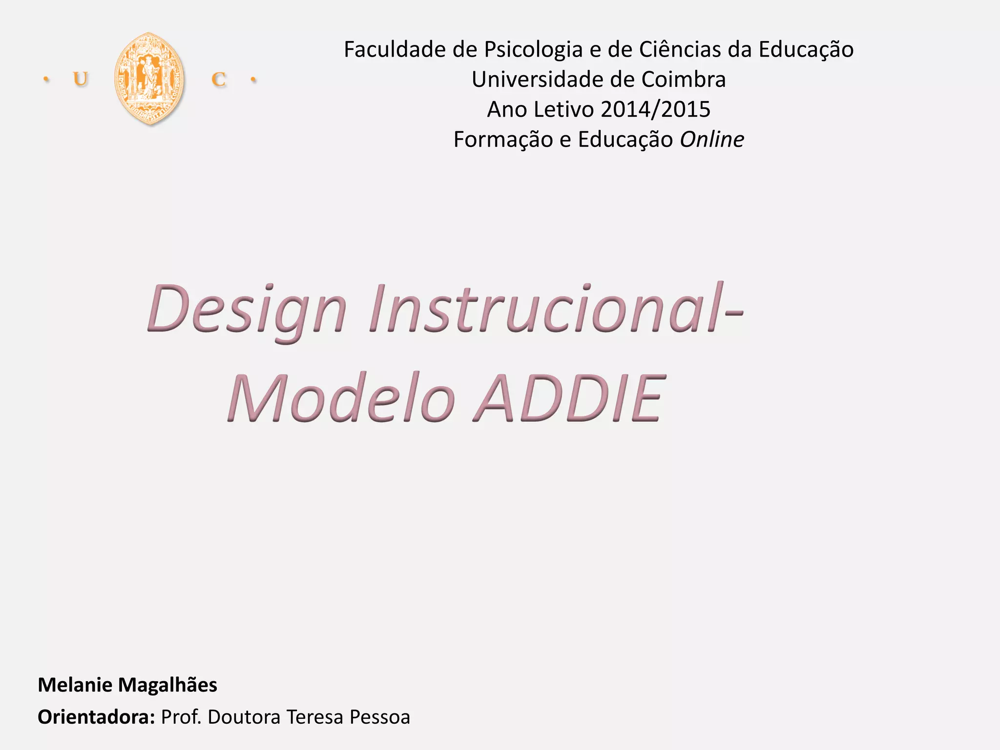 O documento descreve o modelo ADDIE para o design instrucional de um curso online. O modelo inclui 5 fases: Análise, Design, Desenvolvimento, Implementação e Avaliação. A fase de Análise envolve analisar o contexto, público-alvo e objetivos do curso. A fase de Design inclui planejar a sequência dos conteúdos e atividades de avaliação. A fase de Desenvolvimento envolve criar os conteúdos e atividades do curso. A Implementação disponibiliza o curso. A Avaliação verifica a satisf
