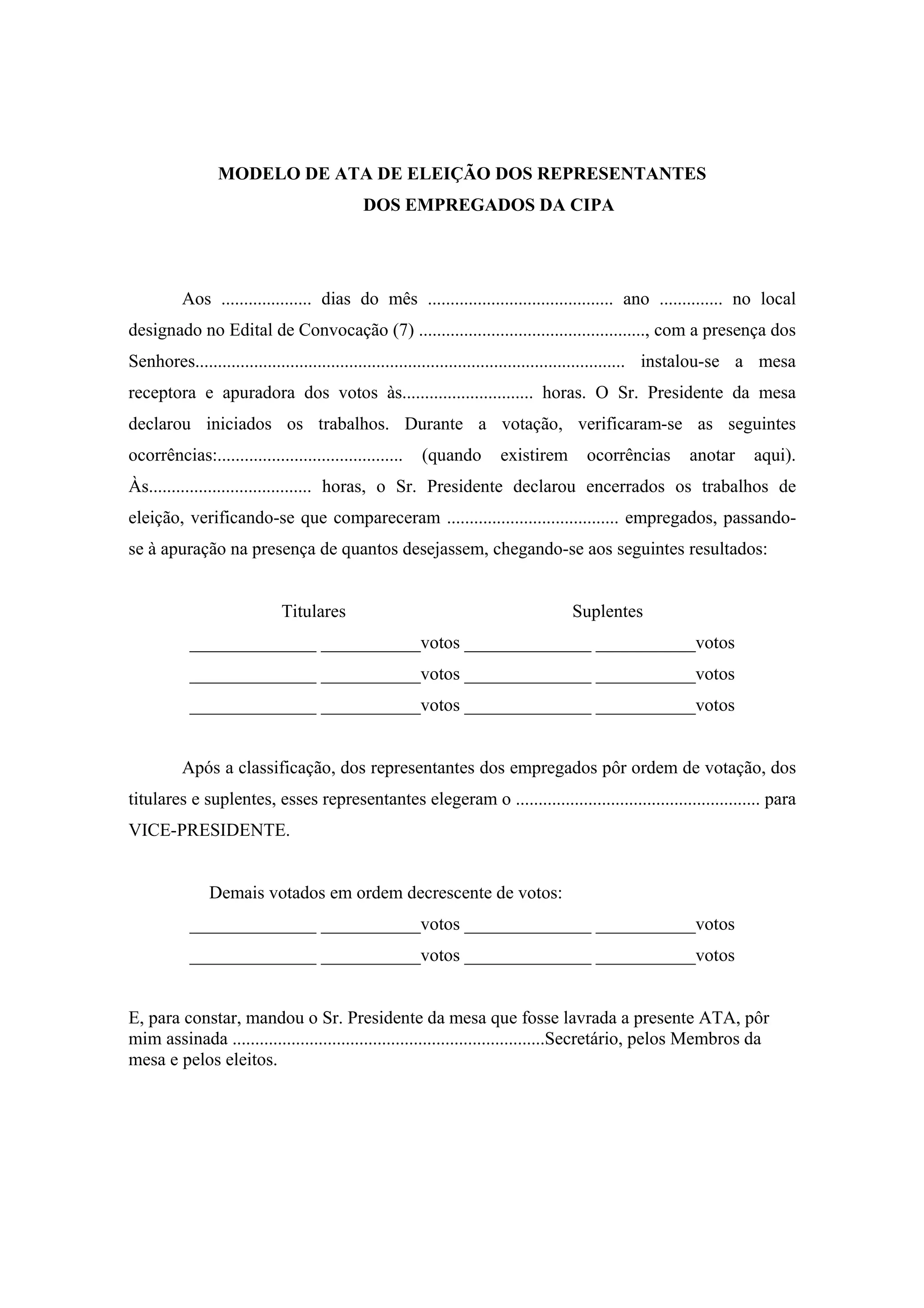 O documento descreve a ata de uma eleição para representantes dos empregados da CIPA. A eleição ocorreu em um determinado local e data com a presença de funcionários e uma mesa receptora. Foram eleitos titulares e suplentes para os cargos de representante, e um vice-presidente foi escolhido entre os representantes eleitos. A ata foi assinada pelos membros da mesa e pelos representantes eleitos.