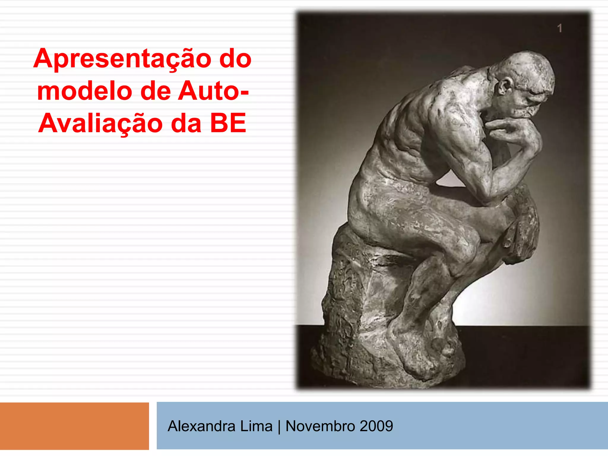 O documento apresenta um modelo de auto-avaliação para bibliotecas escolares (BE) com o objetivo de avaliar o trabalho da BE, seu impacto na escola e nas aprendizagens dos alunos, e identificar áreas de sucesso e melhoria. O modelo estrutura a avaliação em quatro domínios e pretende ser um instrumento pedagógico para orientar as escolas em melhorar continuamente.