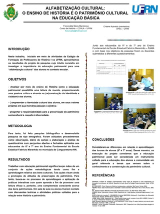 Este documento descreve um projeto de pesquisa que investigou a importância da educação patrimonial para alfabetizar culturalmente alunos do 6o e 7o ano do ensino fundamental. O projeto aplicou questionários e atividades práticas sobre história e patrimônio cultural com os alunos. Os resultados mostraram que a educação patrimonial pode ser um instrumento eficaz para educar alunos e a comunidade sobre a preservação do patrimônio cultural.