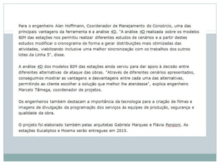 A análise 4D de modelos BIM facilitou a tomada de decisões no projeto de duas estações do metrô de São Paulo, integrando planejamento, programação e simulação de construção para identificar e resolver conflitos no cronograma.