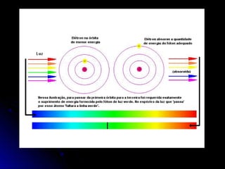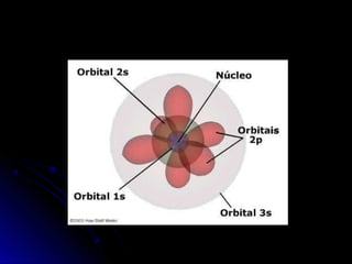 O documento discute a evolução dos modelos atômicos, começando pelo modelo de Thomson em 1909, passando pelo modelo de Rutherford em 1911 e modelo de Bohr em 1913, até chegar no modelo atômico atual proposto por Schrödinger em 1933. O modelo atual descreve os elétrons como nuvens de probabilidade ao redor do núcleo, em vez de órbitas definidas, refletindo a natureza ondulatória dos elétrons.
