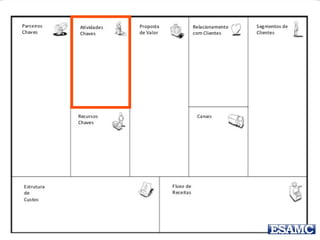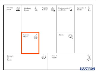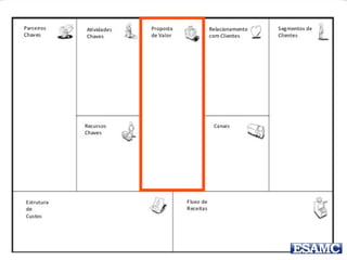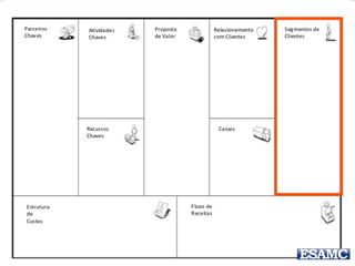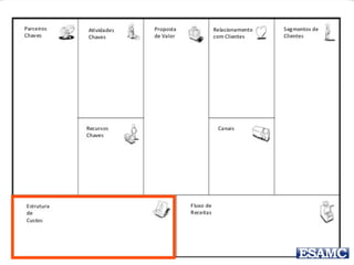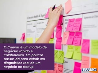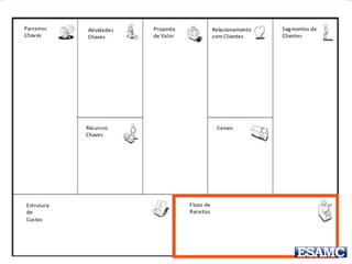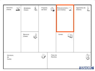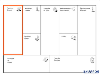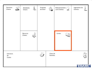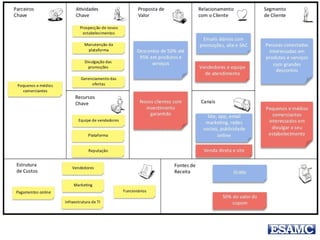 O documento apresenta o modelo canvas de negócios de Renato Melo, destacando suas partes essenciais como parceiros-chave, atividades-chave, recursos-chave, proposta de valor, relacionamento com o cliente, canais, segmentos de clientes, estrutura de custos e fluxos de receita. Além disso, menciona exemplos práticos e um estudo de caso sobre o Groupon, ilustrando como o modelo pode ser aplicado. O documento também inclui uma instrução para um trabalho em grupo relacionado à inovação na educação.