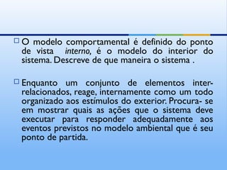 1) O documento discute a modelagem de sistemas do ponto de vista comportamental e estrutural.