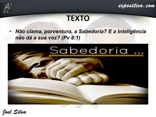 Este documento discute o tema da sabedoria no livro de Provérbios. A sabedoria é personificada e clama aos homens para que se afastem da necedade e abracem o conhecimento. Aqueles que rejeitam a sabedoria colherão o fruto de sua escolha, enquanto os sábios encontrarão proteção. O documento também faz uma comparação entre a sabedoria terrena e a divina revelada em Cristo.